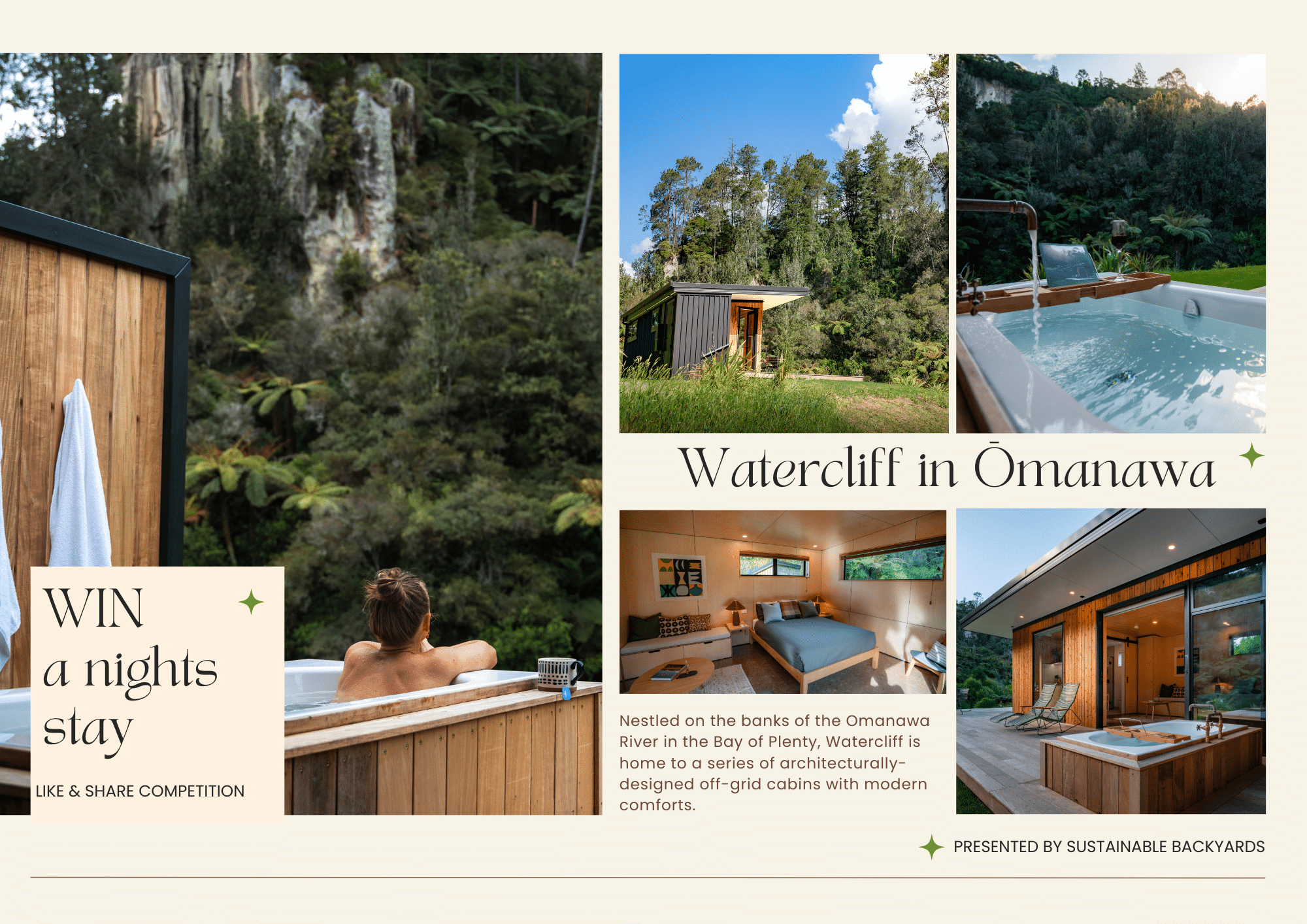 Sustainable Backyards 2026 is almost upon us! To celebrate, we are giving away a night’s stay for two at the beautiful Watercliff, a stunning eco-friendly cabin nestled amongst the cliffs and rivers of Ōmanawa.